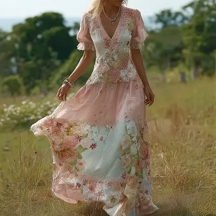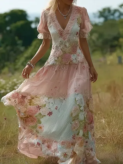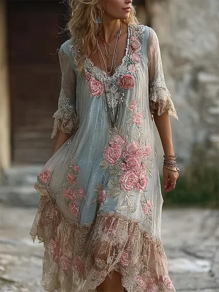 Vintage Boho Pink Roses Lace Layered Linen Maxi Dress