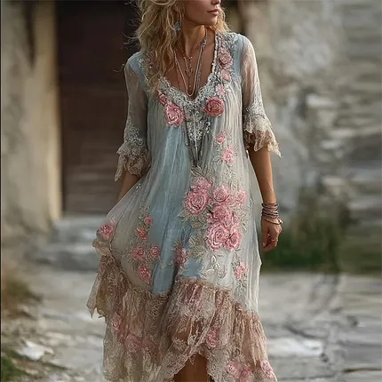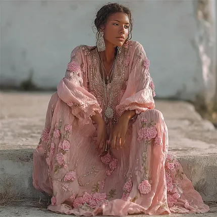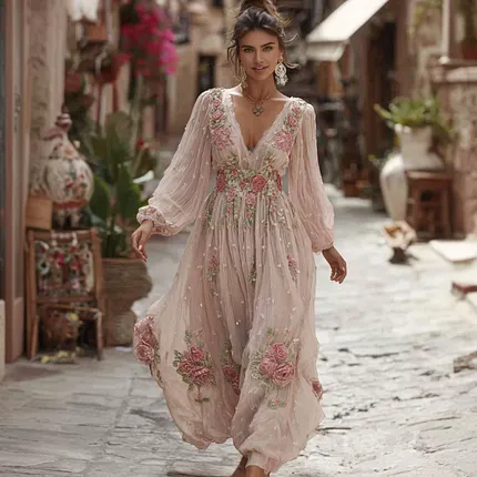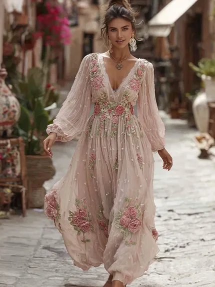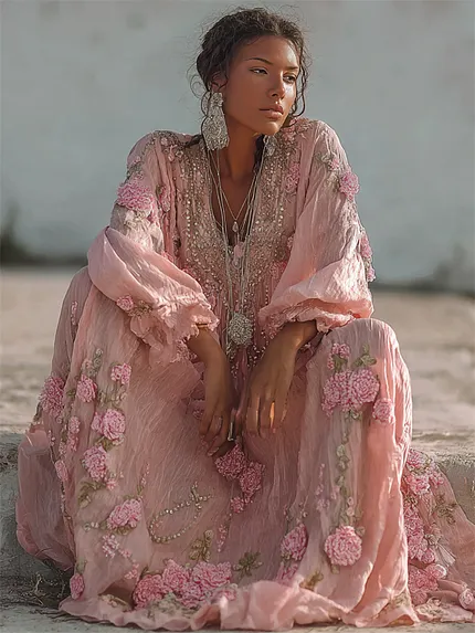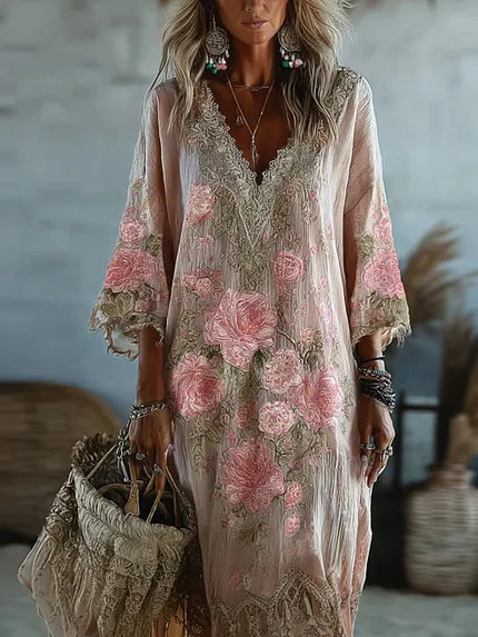 Women’s Bohemian Style Pink Rose Embroidery Comfortable Holiday Dress