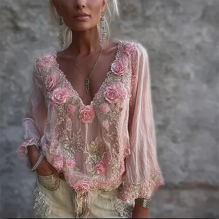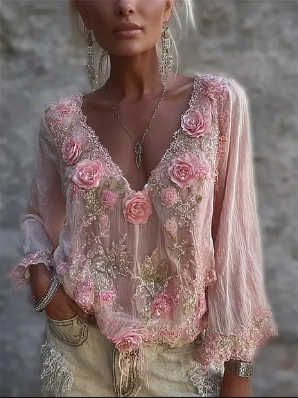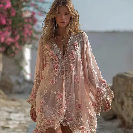 Boho Pink Roses Glitter Lace Flowy Linen Tunic