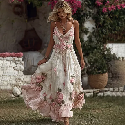 Women’s Bohemia Pink Rose Art Suspender Maxi Dress