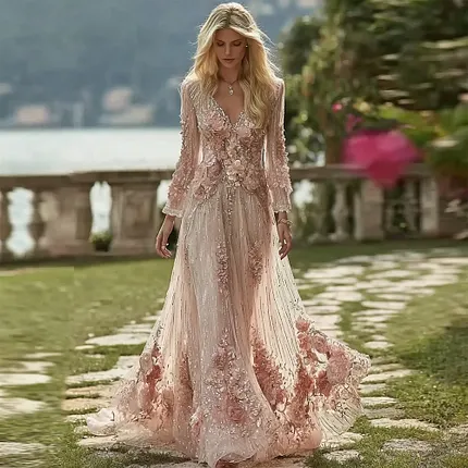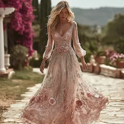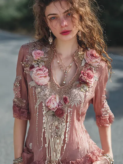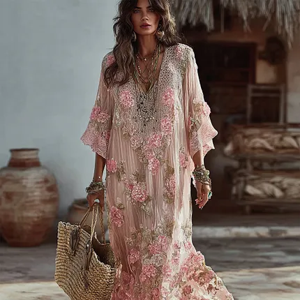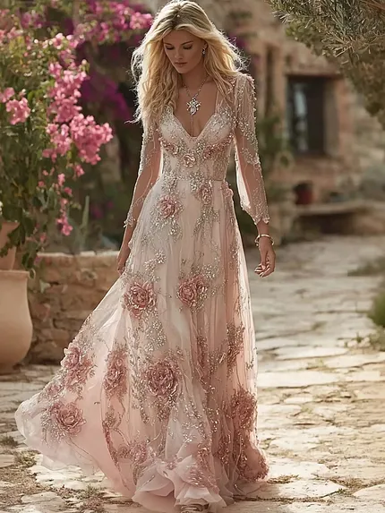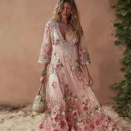 Boho Pink Roses Embroidered Glitter Flowy Linen Maxi Dress