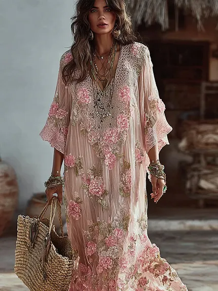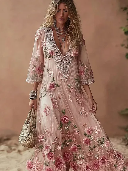Boho Pink Roses Lace Patchwork Flowy Linen Maxi Dress