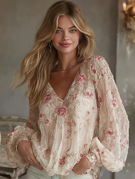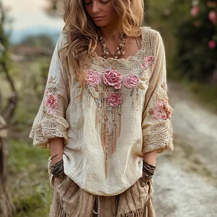 Bohemian Style Pink Floral Embroidered Casual Round Neck Top