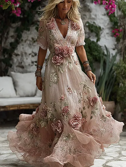 Women’s Bohemian Pink Rose Glitter Casual V-neck Short Sleeve Dress