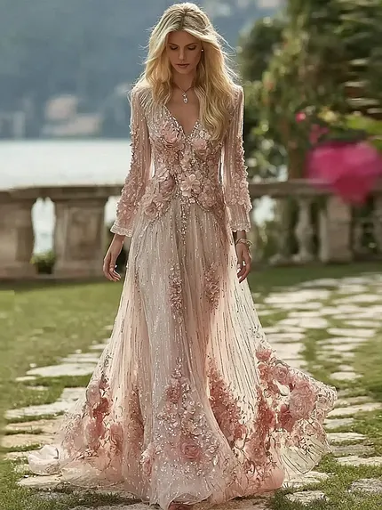 Retro Pink Rose Design V-neck Long-sleeve Casual Dress