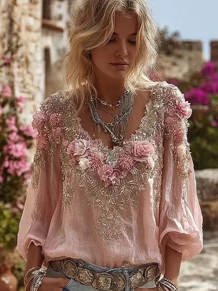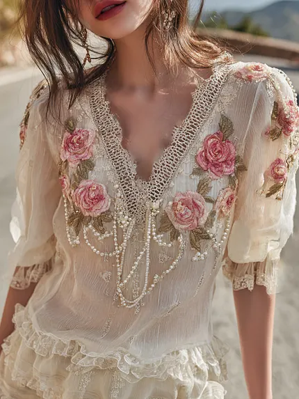 Vintage Bohemian Pink Rose Pearl String V-neck Short Sleeve Top