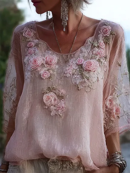 Women’s Retro Pink Rose Embroidered Linen Blend T-shirt