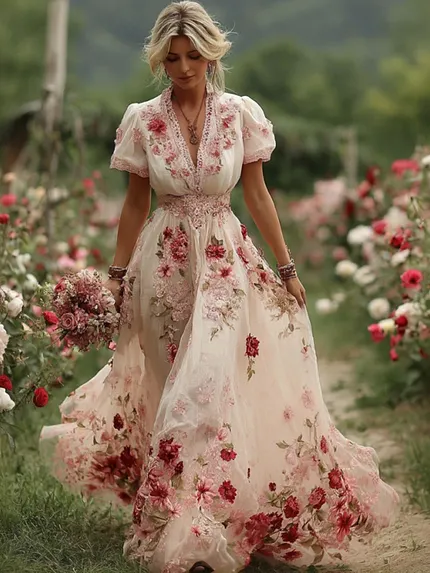 Vintage Boho Roses Embroidered Glitter Flowy Maxi Dress