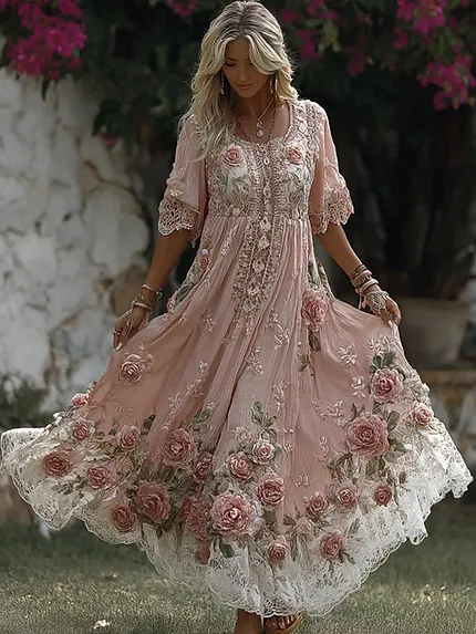 Women’s Vintage Pink Rose Art Casual Maxi Dress