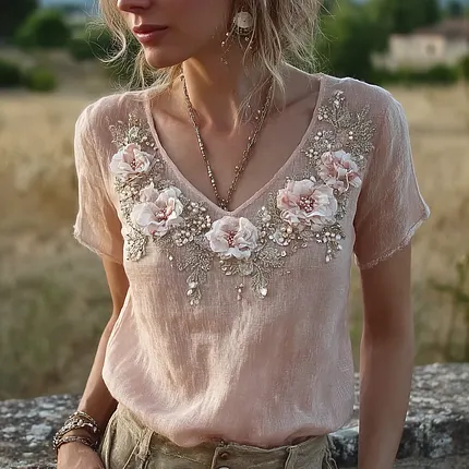 Women’s Pink Embroidered Rose Art V-neck Lightweight Short-sleeved T-shirt
