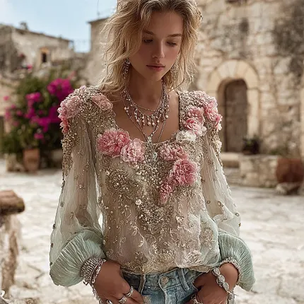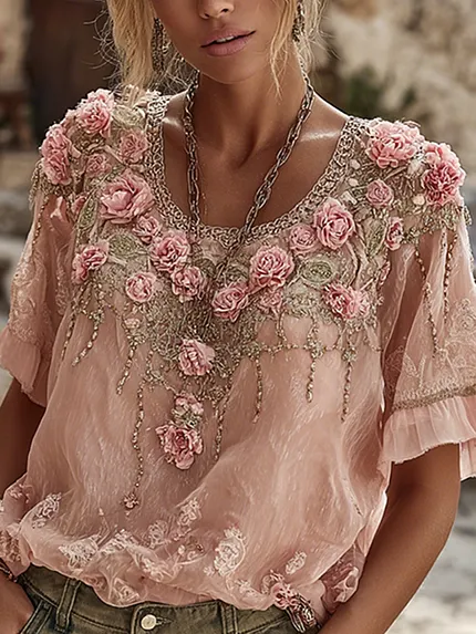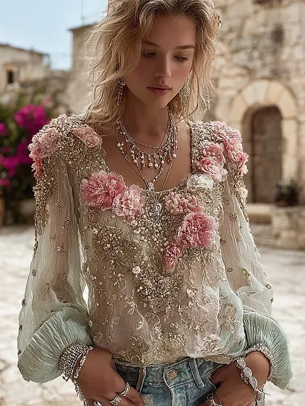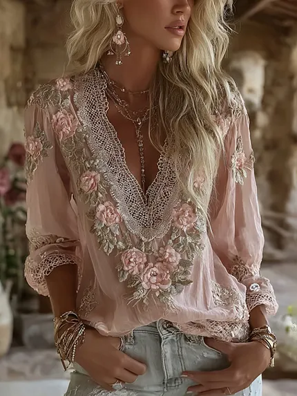 Women’s Bohemian Rose Embroidery Vintage Crew Neck Long Sleeve Top