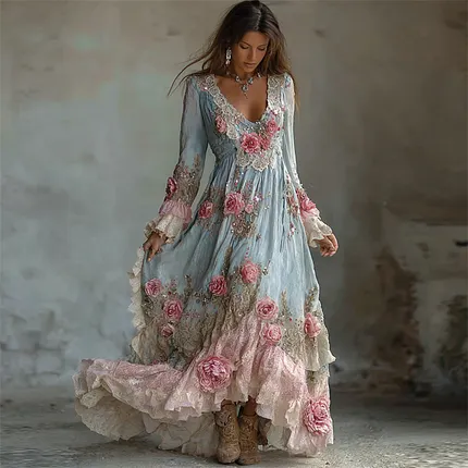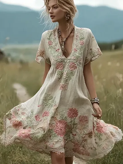 Bohemian Retro Countryside Style Plant Flower Design Women’s Linen Dress