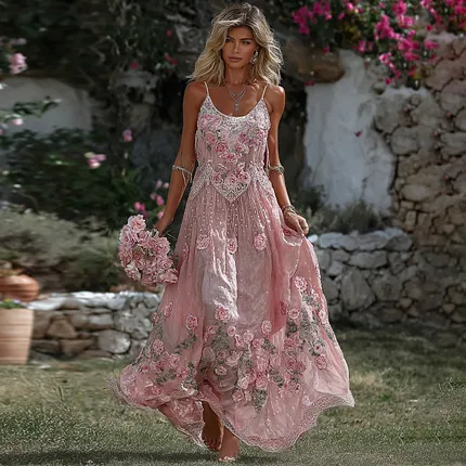 Retro Bohemian Pink Rose Embroidery Art Camisole Top