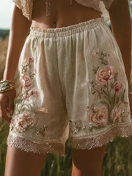 Bohemian Retro Style Plant Flower Design Women’s Linen Casual Shorts