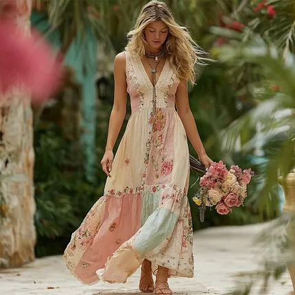 Women’s Rose Floral Patchwork Casual Resort Linen Blend Sleeveless Dress
