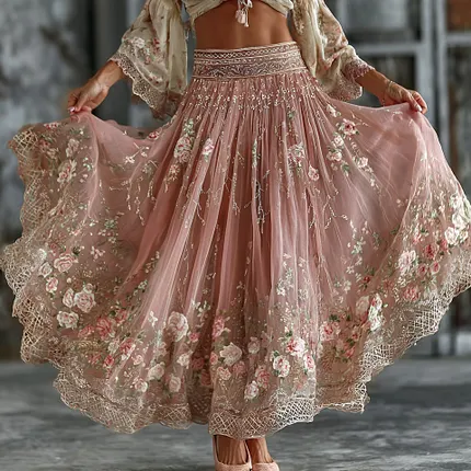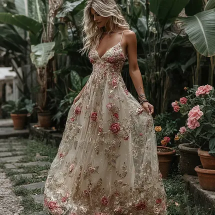 Women’s Bohemia Retro Pink Rose Embroidery Art Suspender Maxi Dress