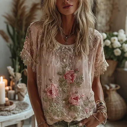 Women’s Pink Flower Embroidered Art Short Sleeve T-shirt